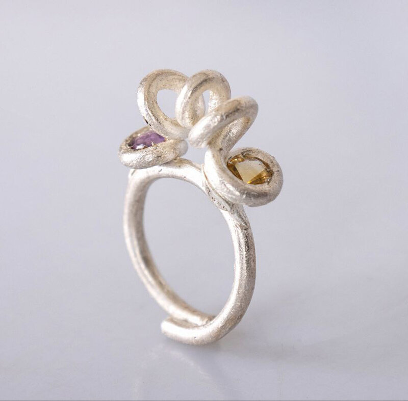 Anello in argento 925,unico esemplare, realizzato completamente a mano con l'antica arte scultorea della cera persa, con Quarzo Citrino naturale, taglio tondo, buffet top, proveniente dal Brasile ed Ametista, taglio tondo, Buffet Top, proveniente dal Brasile, Con gambo regolabile.
