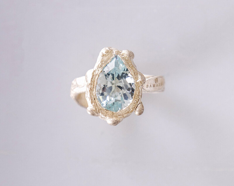 Anello in argento 925, realizzato completamente a mano con l'antica arte scultorea della cera persa, con Topazio Azzurro, naturale, taglio a goccia, proveniente dal Brasile. Gambo regolabile.