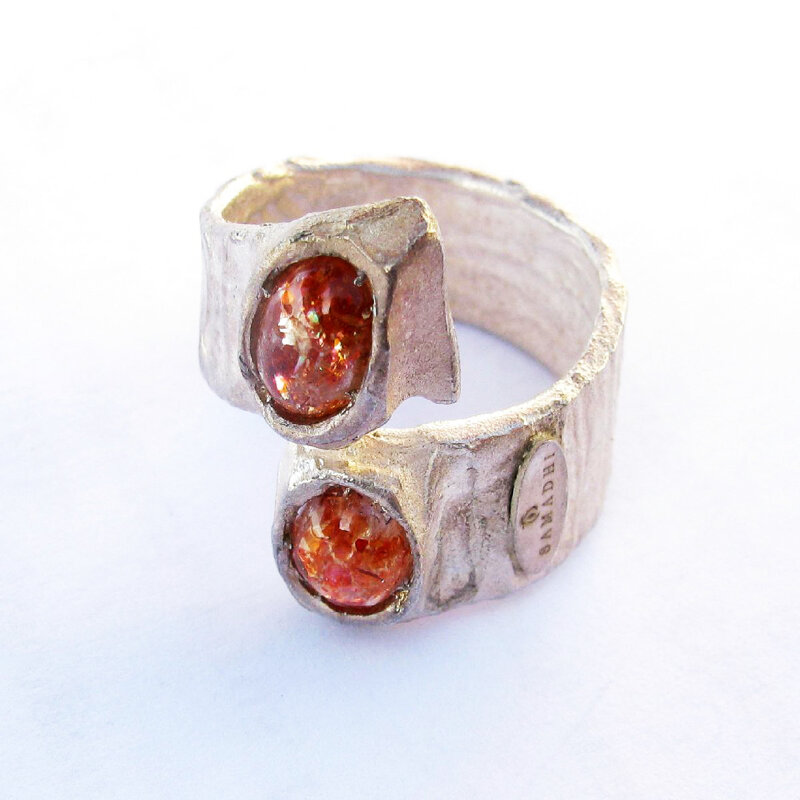 Anello in argento 925, realizzato interamente a mano con l'antica arte scultorea della cera persa, con due “Pietra del Sole” , taglio cabochon ovale, provenienti dall'India. Esemplare unico.