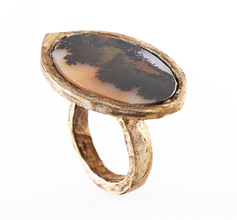 Anello in bronzo, creato interamente a mano, con l'antica arte scultorea della cera persa, con Agata dendritica naturale, proveniente dal Uttar Pradesh, India. Unico esemplare.